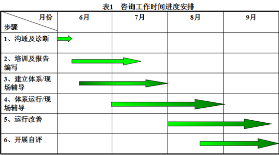 实施计划: 依照卓越绩效模式建立过程,确定了六大步骤对企业进行咨询辅导,并明确咨询工作进度